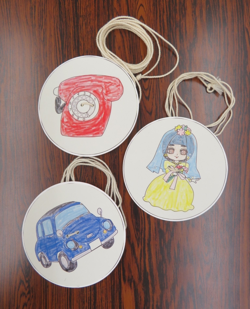 コースターの昭和レトロなイラストに色をぬり、中央部に穴を開けて糸を通して、糸がほどけないように結ぶとぶんぶんごまの完成です。コマを大きく回して糸を十分にねじり、両手で糸をひっぱったりゆるめたりすると、コマがぐるぐると回ります。