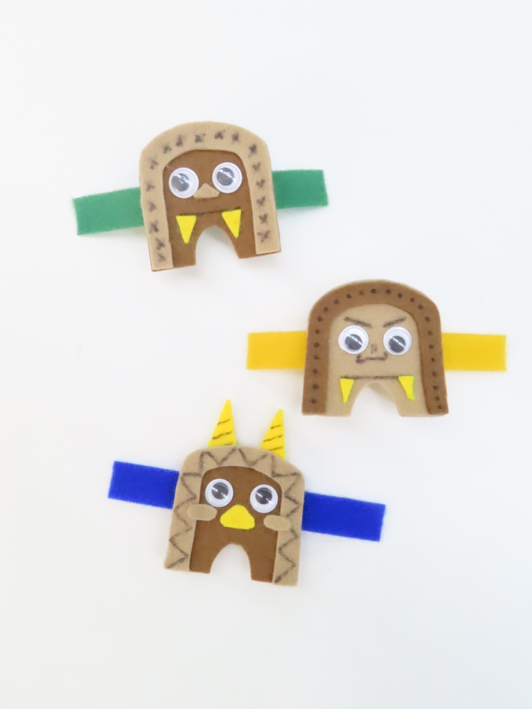 型紙に合わせて2枚のフェルトを鬼がわらの形に切り、貼り合わせます。このフェルトに目玉シールをつけたりサインペンで顔を描いたりします。最後に、フェルトの裏面にマジックテープをつけると、「鬼がわらちゃん👹バンド」の完成です。